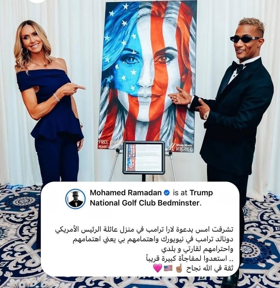 ظهر رمضان في صور من داخل النادي، متبادلًا التحية مع لارا ترامب أمام لوحة تحمل ألوان العلم الأمريكي. وأرفق الفنان منشوره برسالة شكر، مؤكّدًا تقدير العائلة له، ومعلنًا أنه يجهّز «مفاجأة كبيرة» لجمهوره قريبًا.