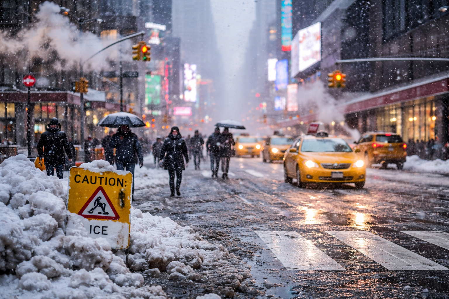 يتوقع استمرار ثلوج كثيفة في ساعات الصباح مع رياح نشطة، ثم يتحول الطقس إلى زخات مطر وثلج خلال فترة بعد الظهر. هذه التركيبة ترفع احتمال تكوّن طبقة جليد لاحقًا مع انخفاض الحرارة ليلًا، ما يجعل القيادة والمشي شديدي الخطورة، خصوصًا على الطرق الجانبية والأرصفة.