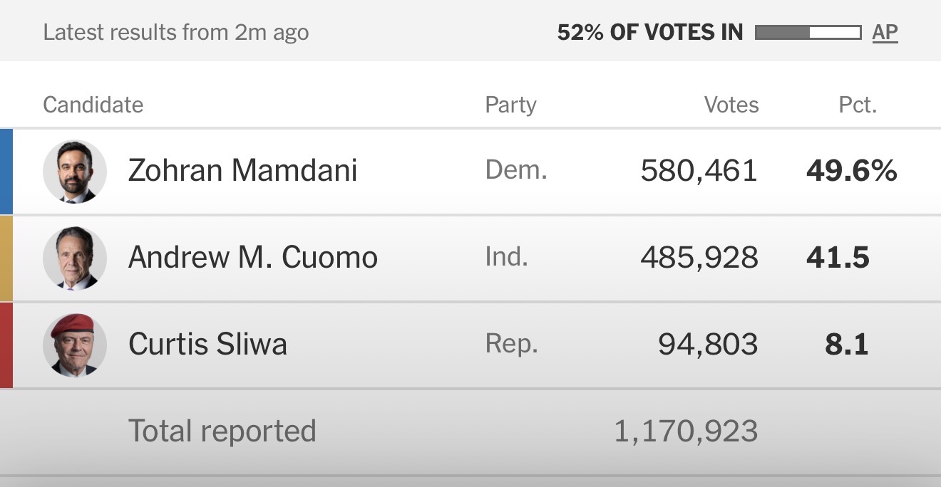 وحصل ممداني حتى لحظة كتابة الخبر على 580,461 صوتاً (49.6%)، بينما جاء المنافس المستقل أندرو كومو في المركز الثاني بـ485,928 صوتاً (41.5%)، وحل كيرتس سليوا ثالثاً بـ94,803 أصوات (8.1%)، من إجمالي أكثر من 1.17 مليون صوت جرى فرزهم حتى الآن.