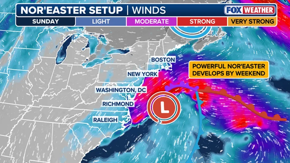 مصطلح «نورإيستر» (Nor’easter) يُستخدم في أمريكا لوصف عاصفة ساحلية تتحرك عادةً على طول الساحل الشرقي، وتكون رياحها في مناطق واسعة قادمة من اتجاه الشمال الشرقي، وغالبًا ما تجلب معها ثلوجًا أو أمطارًا متجمدة ورياحًا قوية واضطرابات في السفر.