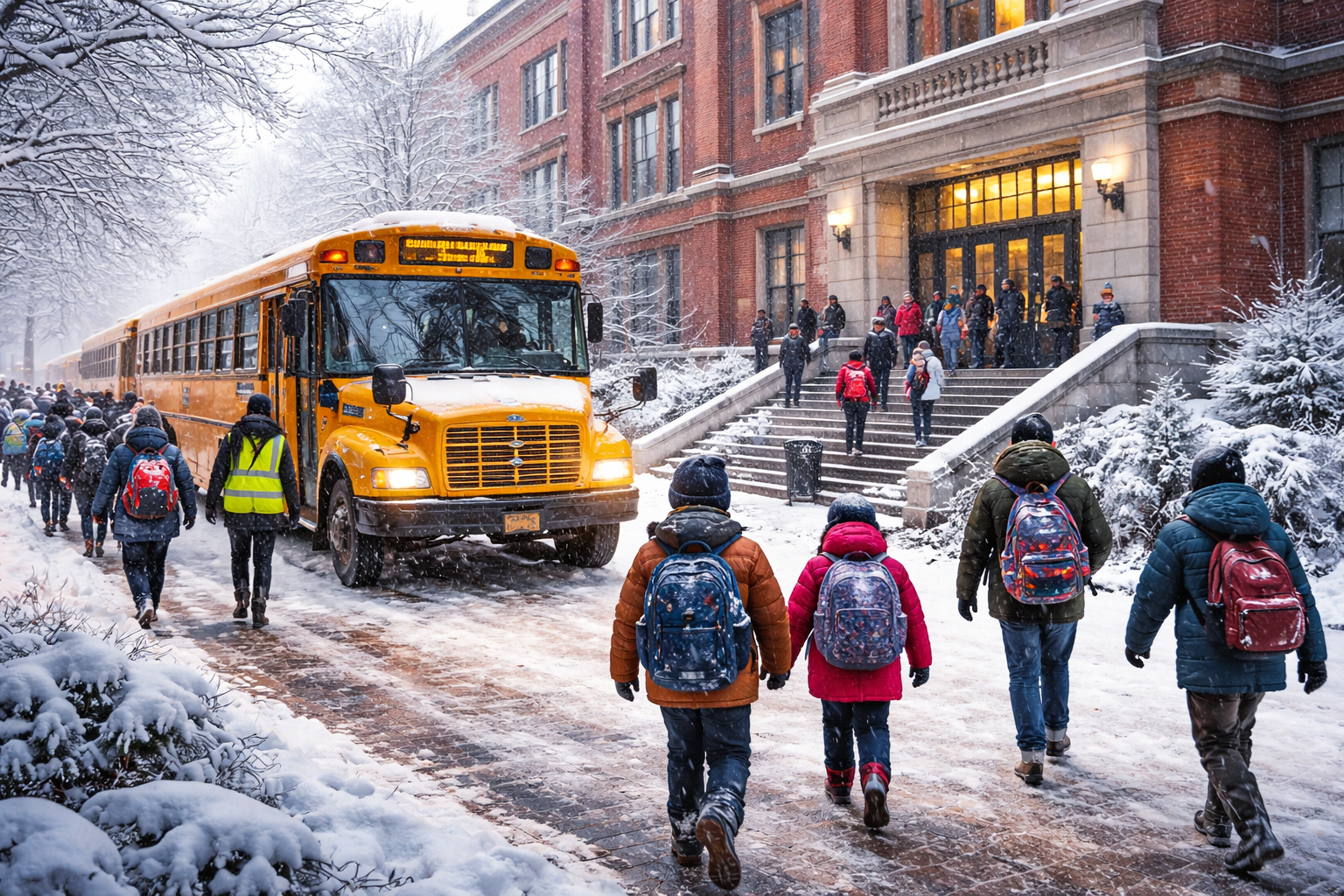 رغم عودة الدراسة حضوريًا، تتوقع المدينة استمرار بعض صعوبات الحركة في الشوارع الجانبية والممرات المحيطة بالمدارس بسبب تراكمات الثلوج والجليد، لذا يُنصح بترك وقت إضافي للوصول، والانتباه للأطفال أثناء السير قرب الأرصفة الزلقة ومناطق تجمع الثلج.