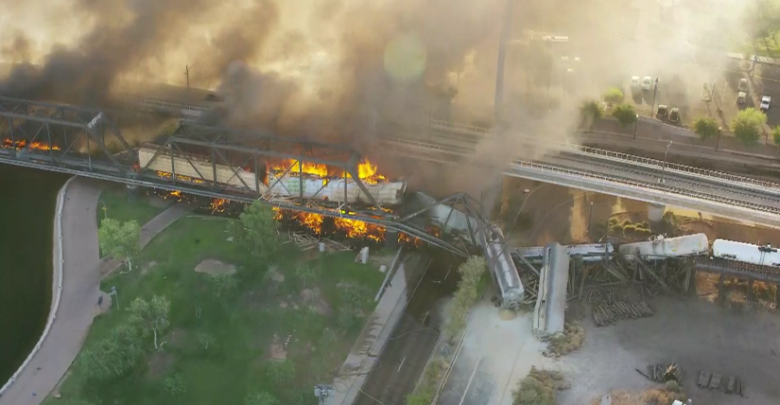 بالفيديو والصور.. حريق هائل فى قطار انحرف عن مساره بأريزونا